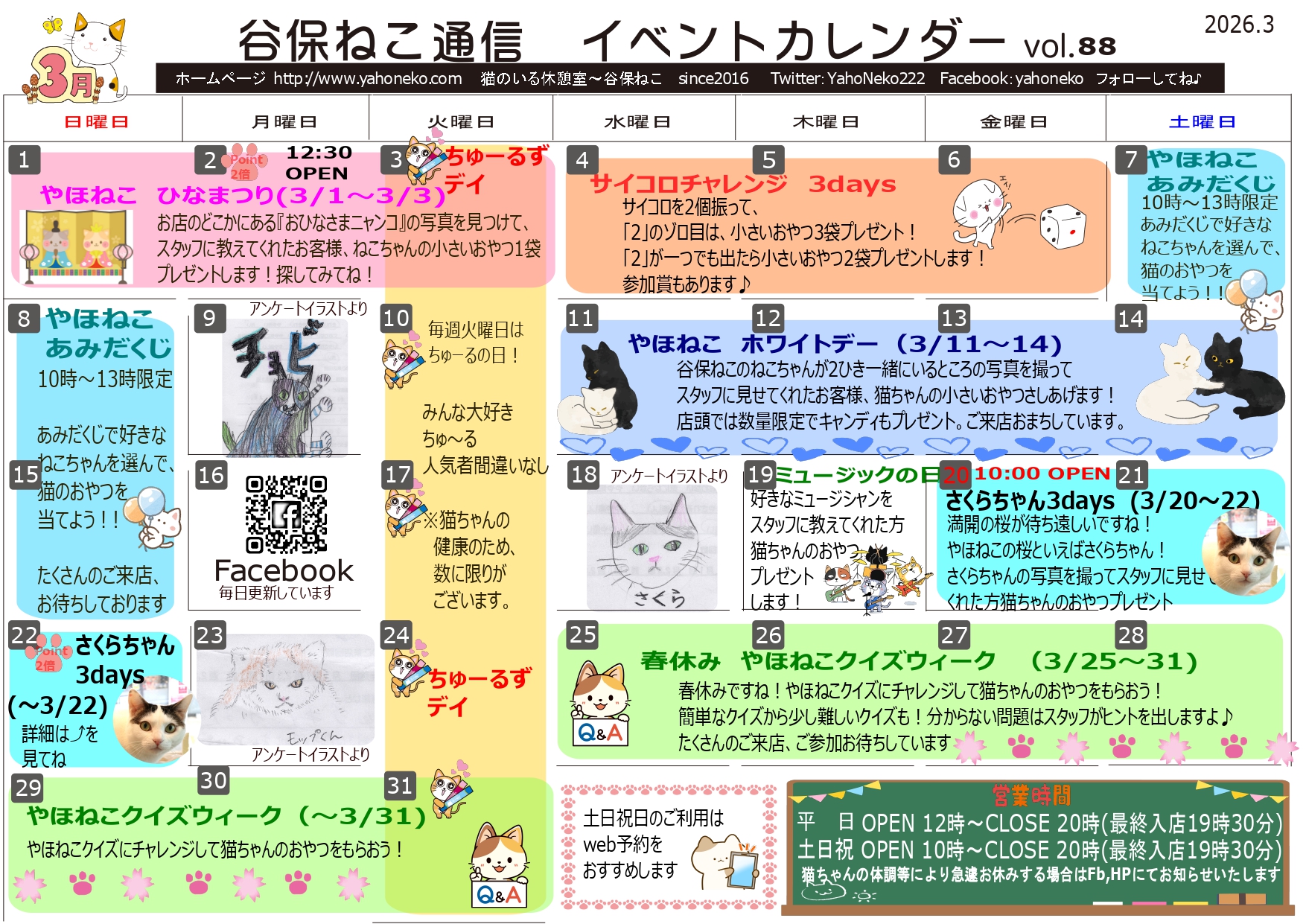| 営業時間 | 平日 12:00~20:00 (最終入店 19:30) 土日祝日 10:00~20:00 (最終入店 19:30) ※猫ちゃんの体調や情勢により時短営業もしくは急遽お休みさせて頂くこともございます。 お休みの際にはホームページにてお知らせいたします。 |